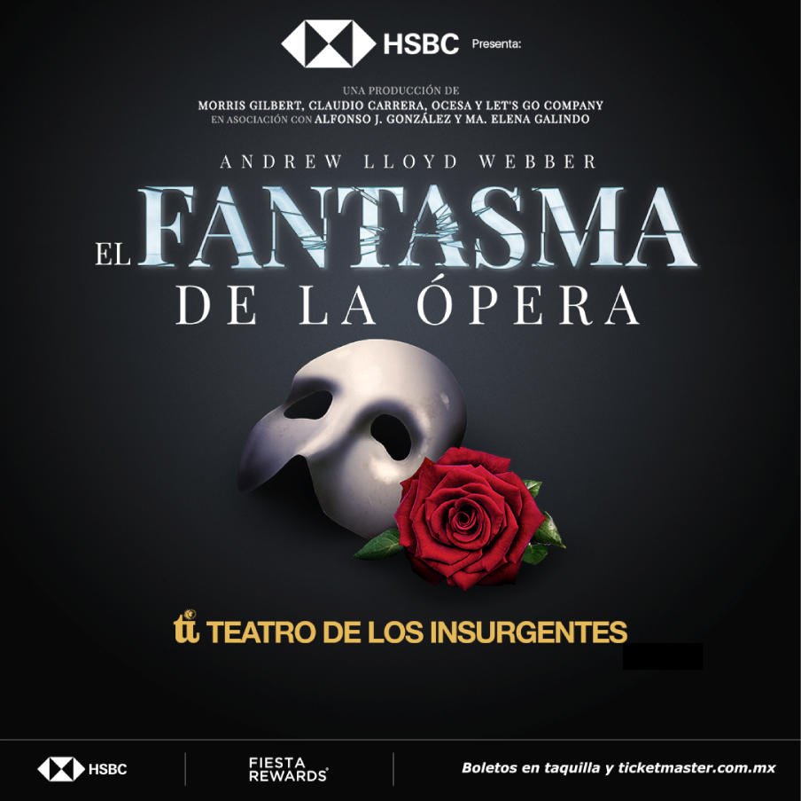 Promoción válida para redimir del 10 de febrero al 7 de abril de 2026 al *8585. Promoción exclusiva para socios Fiesta Rewards. Redime 77,000 puntos Fiesta Rewards por un pase doble HSBC PREMIERE para la obra de teatro El Fantasma de la Opera que tendrá lugar el 8 de abril de 2026 en el Teatro Insurgentes, Ciudad de México, a las 20:00 hrs. Limitado a 3 pases dobles. No incluye alimentos ni bebidas. No incluye propinas ni estacionamiento. No incluye traslados ni cualquier consumo en el recinto. No incluye vuelo ni hospedaje. Cualquier consumo adicional deberá ser cubierto por el socio. No participan empleados o colaboradores de Grupo Posadas, S.A.B. de C.V. (“Posadas”) ni ninguna empresa afiliada o subsidiaria de Posadas. Posadas no garantiza la realización del evento en las fechas y lugar señalados, toda vez que el realizador es externo a Posadas, de igual forma Grupo Posadas no se hace responsable por artículos personales extraviados o sustraídos dentro ni fuera del recinto. No participarán quienes tengan cuentas Fiesta Rewards suspendidas o canceladas. No aplica para cuentas corporativas, empresariales o grupales. Los socios deberán hacerse responsables de su traslado al evento. Posadas se reserva el derecho de modificar los presentes términos y condiciones. Los pases no son intercambiables ni reembolsables en dinero ni en puntos Fiesta Rewards. El socio es responsable de mantener sus datos actualizados en su cuenta Fiesta Rewards. Los boletos se entregarán vía correo electrónico al mail que el socio indique, en dicho mail estará un código QR que los socios deberán mostrar en taquilla para obtener sus boletos. Se recomienda llegar una hora antes. Responsable de la promoción: Grupo Posadas, S.A.B. de C.V., con domicilio en Avenida Prolongación Paseo de la Reforma, Número Exterior 1015 Torre A, Número Interior piso 9, Colonia Santa Fe Cuajimalpa, Alcaldía Cuajimalpa de Morelos, Código Postal 05348, Ciudad de México. En caso de alguna queja, reclamación o comentario relacionado con esta promoción, comunicarte al teléfono 4431135841 en un horario de 09:00 a 20:00 hrs. de lunes a domingo.